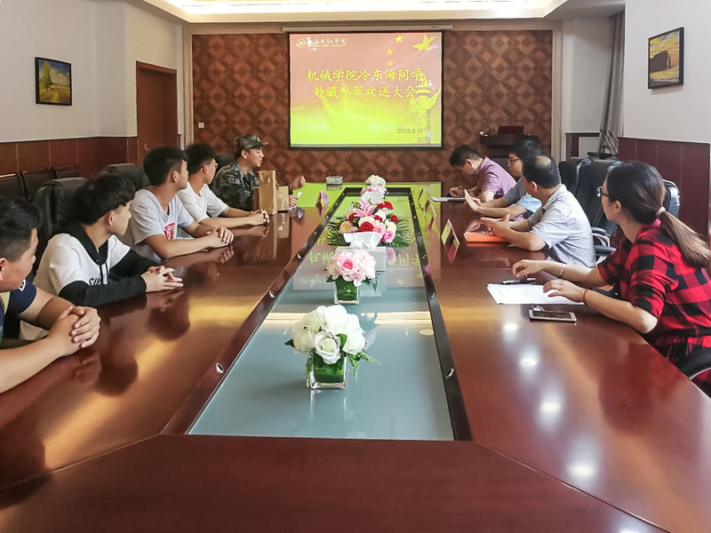 9月11日上午,3044AM永利举行冷东海同学赴藏参兵欢送会。公司党委学工部部长朱健、公司党总支书记卞一明、公司党委武装部孔祥昆老师、辅导员王洁、杨金平老师和冷东海所在班级的同学代表出席,共同欢送冷东海同学光荣入藏参军。欢送会由王洁老师主持。