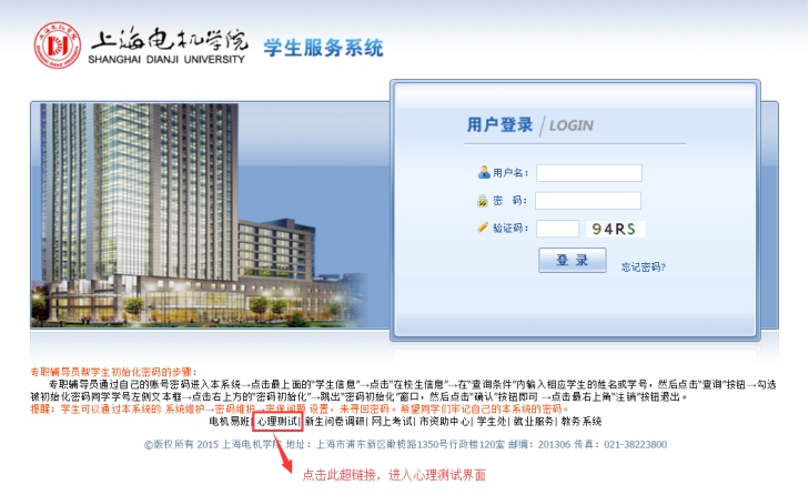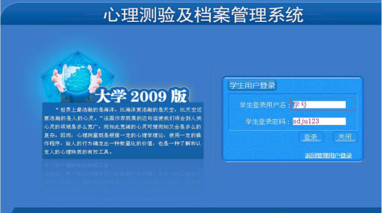 四、心理普测的超链接:http://172.20.20.15:1080/ZhgProgram/frmLogin.aspx