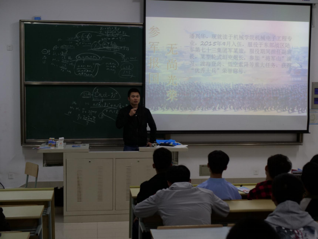武装部孔祥昆老师通过征兵概况、入伍流程、退役优抚、典型案例、常见问题答疑和参军入伍的意义等六个方面向同学们进行全面讲解