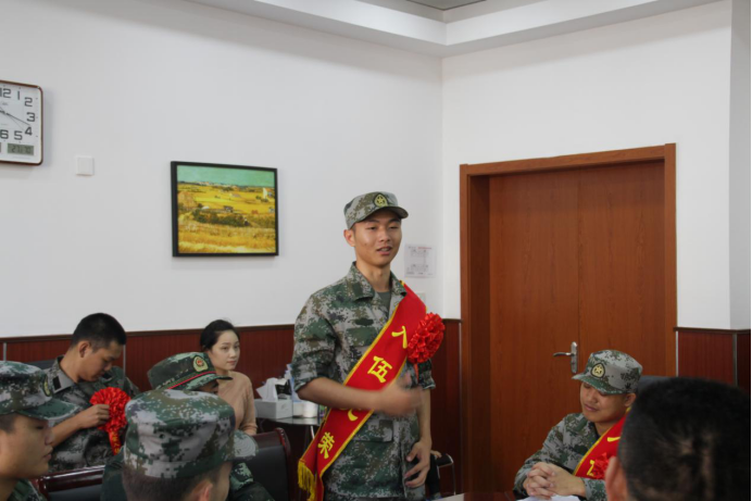 接下来由新兵代表鲁翔同学发言,表达了他对于祖国的热爱,以及对于自己在军营生活的美好期待,他坚信能够发扬不怕苦、不怕累、流血流汗不流泪的精神。