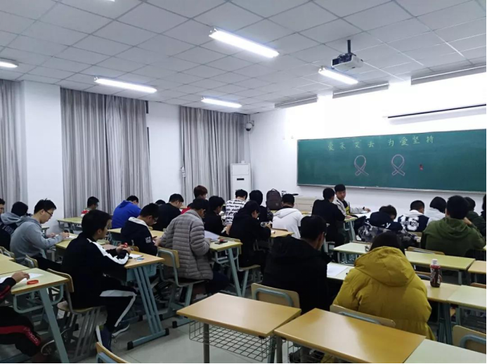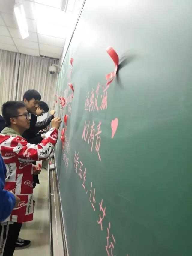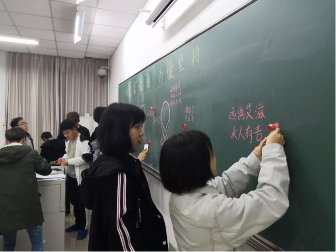 大家亲手制作完红丝带,本次活动进入高潮环节——“艾滋病,你好,我有一句话想对你讲”,大家都觉得特别有趣和有意义,都积极参与到当中来,纷纷的走上讲台在准备好的黑板上写下自己想说的话并粘上自己亲手制作的红丝带。不到一会,黑漆漆的黑板就被大家暖心的话语和红丝带所覆盖。