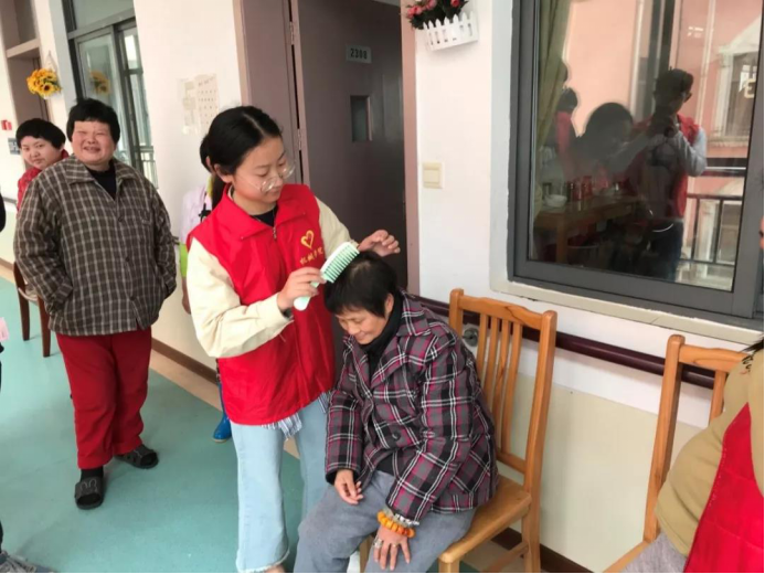 之后开始了此次活动的第二个项目---走进床边看望老人。志愿者们分别前往养护院的2楼、3楼、4楼、5楼看望老人,有主动为老人梳头发的,有主动给老人表演打拳的,也有跟老人畅谈人生的,屋子里顿时充满欢声笑语,老人对于志愿者们的到来很是开心。