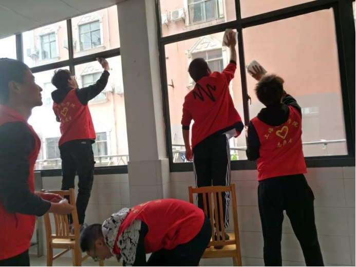 8点40,到达目的地---临港养护院。与李主任进行简单交接后,志愿者们展开了此次活动的第一个项目---打扫卫生。志愿者们打扫卫生十分的积极,不到一个小时就把窗户擦的十分明亮。