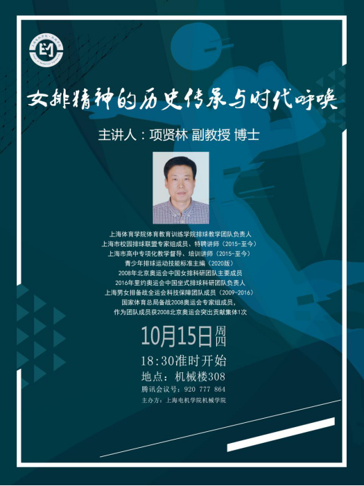 观影前夕,为帮助党员师生、入党积极分子了解中国女子排球运动发展历史、更全面深刻地理解女排精神,公司党总支特别邀请排球运动专家,上海体育公司体育教育训练公司排球教学团队负责人项贤林副教授做了题为“女排精神的历史传承与时代呼唤”的报告。项贤林博士是青少年排球运动技能标准主编、上海市校园排球联盟专家组成员、2008年北京奥运会中国女排科研团队主要成员、2016年里约奥运会中国坐式排球科研团队负责人、上海男女排备战全运会科技保障团队成员(2009-2016),国家体育总局备战2008奥运会专家组成员,作为团队成员,获2008北京奥运会突出贡献集体1次。