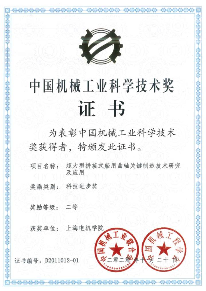 公司与上海电气重工铸锻有限公司、上海船用曲轴有限公司、大连华锐船用曲轴有限公司等企业合作完成的研究成果“超大型拼接式船用曲轴关键制造技术研究及应用”荣获2020年中国机械工业科学技术奖二等奖。该成果针对超大型拼接式船用曲轴高精密、高性能成形的需求,项目组围绕曲柄高质量成形、拼接精度控制和构件制造三个方面的关键技术开展创新研发,“产学研用”协同攻关,形成了具有自主知识产权的超大型拼接式船用曲轴制造技术体系,推进了曲轴制造技术进步。