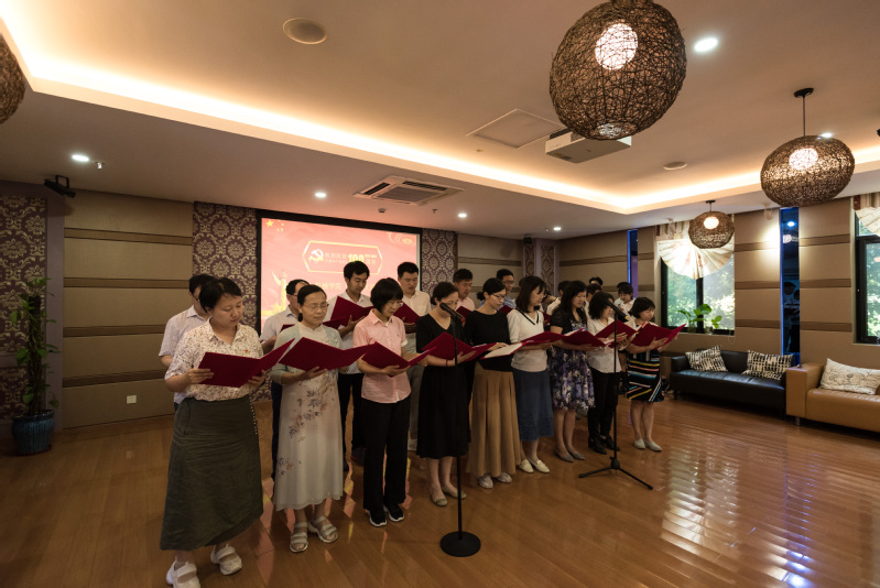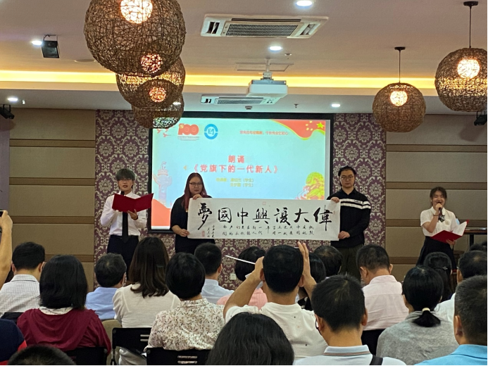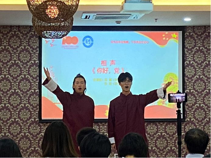 员工代表诗朗诵《党旗下的一代新人》、书法表演《伟大复兴中国梦》、相声表演《你好,党》、合唱《红星闪闪》和集体舞《黄河》展示了3044AM永利广大青年学子的才艺,表明了党旗飘扬的方向是青年人奋勇前行的方向,更表明了广大青年学子听党话跟党走的坚定信念。