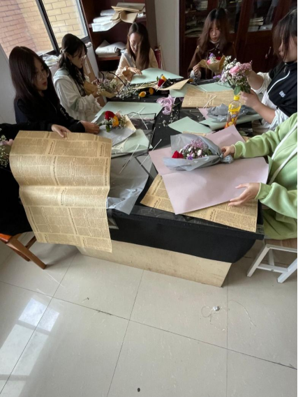 此次活动由参与员工自行创意、动手包扎。首先,要对自己想做的花束进行构思,颜色的搭配、主次的分明等,使手中简单的花束变得惹人喜爱。接着,进行修剪和定位,马展现花束的雏形。最后,用包花纸将花束包裹起来。参与同学小心翼翼地叠着一张张包花纸,不时调整花束位置,最后细心地打上了蝴蝶结,一捆捆精美的花束就完成了。