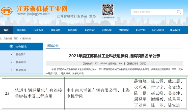近日,江苏省机械行业协会发布了《2021年度江苏机械工业科技进步奖授奖项目名单公示》,公司3044AM永利陈云霞副教授申报的项目《轨道车辆轻量化车身连接关键技术及工程应用》获得2021年度江苏机械工业科技进步奖一等奖。