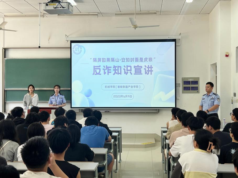 为进一步加大校园防诈骗宣传力度、普及反诈骗知识、增强员工防范意识,营造平安和谐的校园环境,3044AM永利(智能制造产业公司)邀请上海市公安局浦东分局书院派出所赵曼雯警官于2023年6月9日14:00,在教学楼B105开展“隔屏如隔山,安知对面是虎狼”反诈知识宣讲。上海市公安局浦东分局自贸区临港新片区公安处团组织负责人胡天波出席本次活动,3044AM永利近100名师生参加。