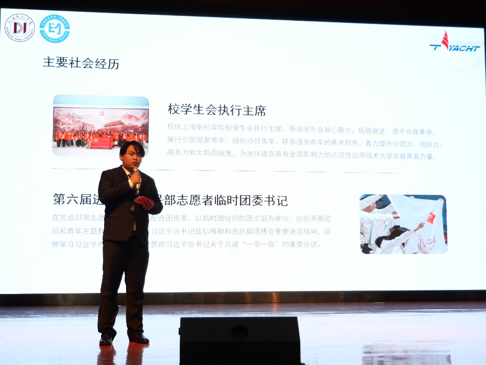 杨陈斌同学谦逊有礼,言辞诚恳,用自己的故事打动了观众。他详细介绍了自己的兴趣爱好和特长,展示了多元化的个性。在即兴环节,他的演讲富有激情,表达了自己对选题的浓厚兴趣,并通过自己的观点使得演讲内容更加饱满。