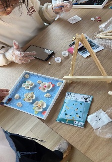 同学们依次挑选自己感兴趣的材料后,静静坐下来,开始思考自己独一无二的创意。新手同学借助教程学习奶油胶的使用方法,模仿教程作出漂亮的作品,已经有经验的同学们便是如鱼得水,在现有的材料上发挥奇思妙想,做出了各种有趣的作品,大家都对自己的成品都十分满意。