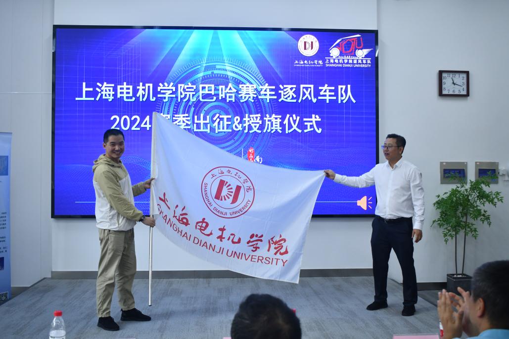 最后,副董事长王宏志将车队校旗授予指导教师程金润,工业技术中心(创新创业教育中心)主任付晓刚将车队队旗授予巴哈赛车队队长王爽并与全体队员合影留念。