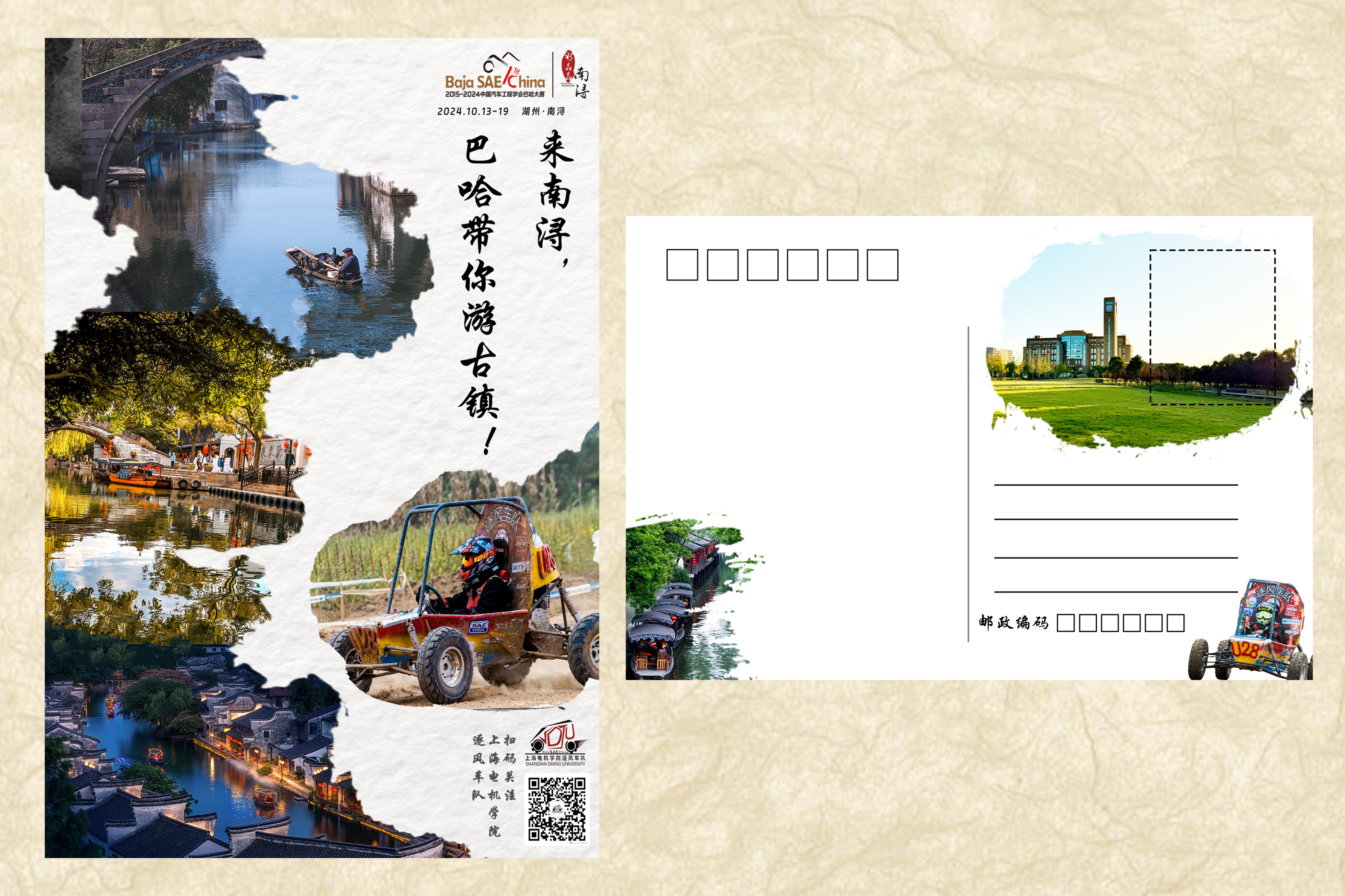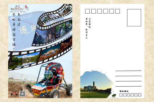 第一张明信片的设计将南浔古镇的传统美与现代赛车运动结合,展示古镇的不同风貌,代表现代赛车运动的巴哈赛车形象融入其中。