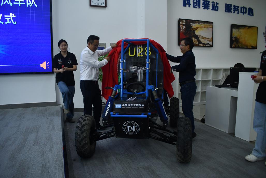 仪式开始,刘军经理首先向莅临现场的各位领导与嘉宾致以热烈的欢迎,并简要地阐述了本次活动的重要意义。王宏志副董事长和付晓刚主任共同为新车U28揭开帷幕,一辆设计新颖、技术先进的巴哈赛车U28在众人的热切期盼中惊艳亮相。随后,车队队长王爽为大家介绍了本赛季新车设计理念、技术亮点及团队在研发过程中的不懈努力与显著成果,展现了车队成员的创新精神与扎实技术。