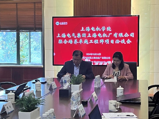 当日上午,首先前往上海电气集团上海电机厂有限公司(以下简称“电机厂”),受到电机厂党委副书记傅彬和总工程师孙明伦及相关部门负责人的热情接待,双方就本次联合培养进行充分交流,刘俊书记代表公司表达“为加强公司与上海电气集团的战略合作,依托电机公司卓越工程师公司,深化产教融合,创建人才培养新模式”的初衷,并表示希望遴选为联合培养的研究生能真切参与到企业的工程实务中,提升自身能力成为真正具备解决工程技术问题能力、服务国家战略需求的卓越现场工程师;电机厂傅彬书记表达了对电机公司师生的热烈欢迎并表示电机公司与电机厂具有深厚的历史渊源,曾向电机厂输送了大量的优秀员工,为公司多年以来深耕电机产业、推动国家建设做出贡献,希望今后能加大合作力度并逐步扩大联合培养规模,从企业需求出发,务实、有组织的开展技术攻关,以此为基础开展科研合作、探索新的教学模式;会议最后,刘俊书记和傅彬书记作为双方代表签订《联合培养卓越工程师协议》。