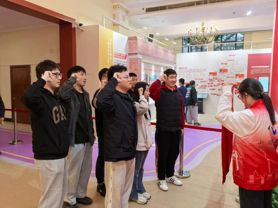 在展览尾厅,支部的预备党员在党旗前庄严宣誓,重温入党誓词,表达了将始终坚持人民至上的信念,继续为党和人民的事业努力奋斗的决心。这一庄严时刻,让每一位党员更加深刻地认识到自己是人民城市建设的亲历者和推动者,使命责任在肩,更要为上海建设习近平文化思想最佳实践地作出新的贡献。